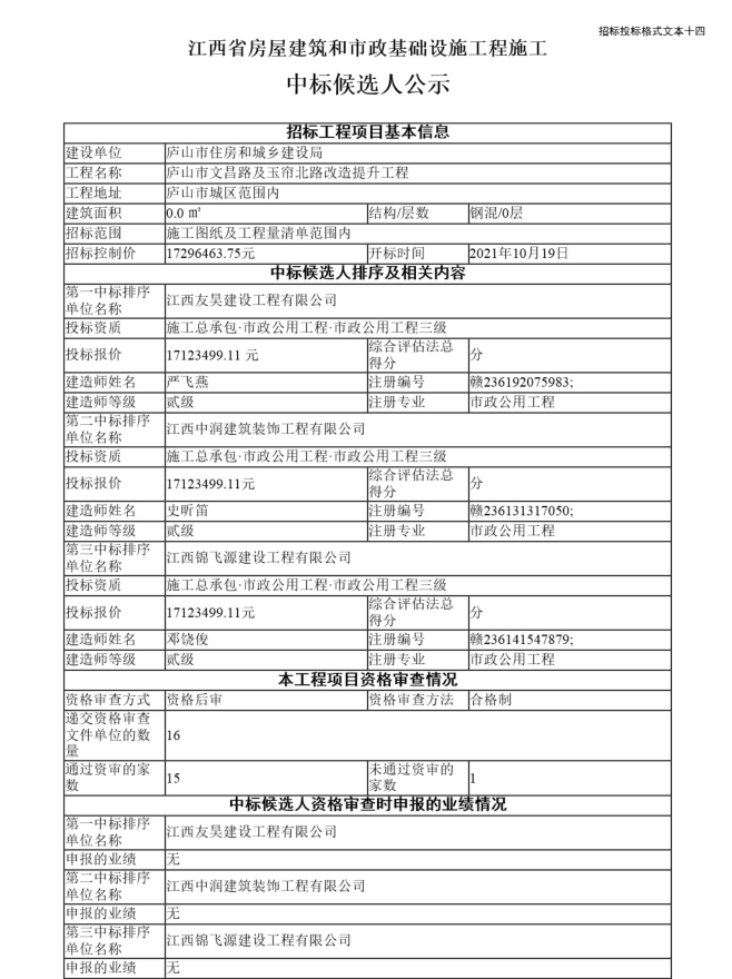 庐山市文昌路及玉帘北路改造提升工程中标排序