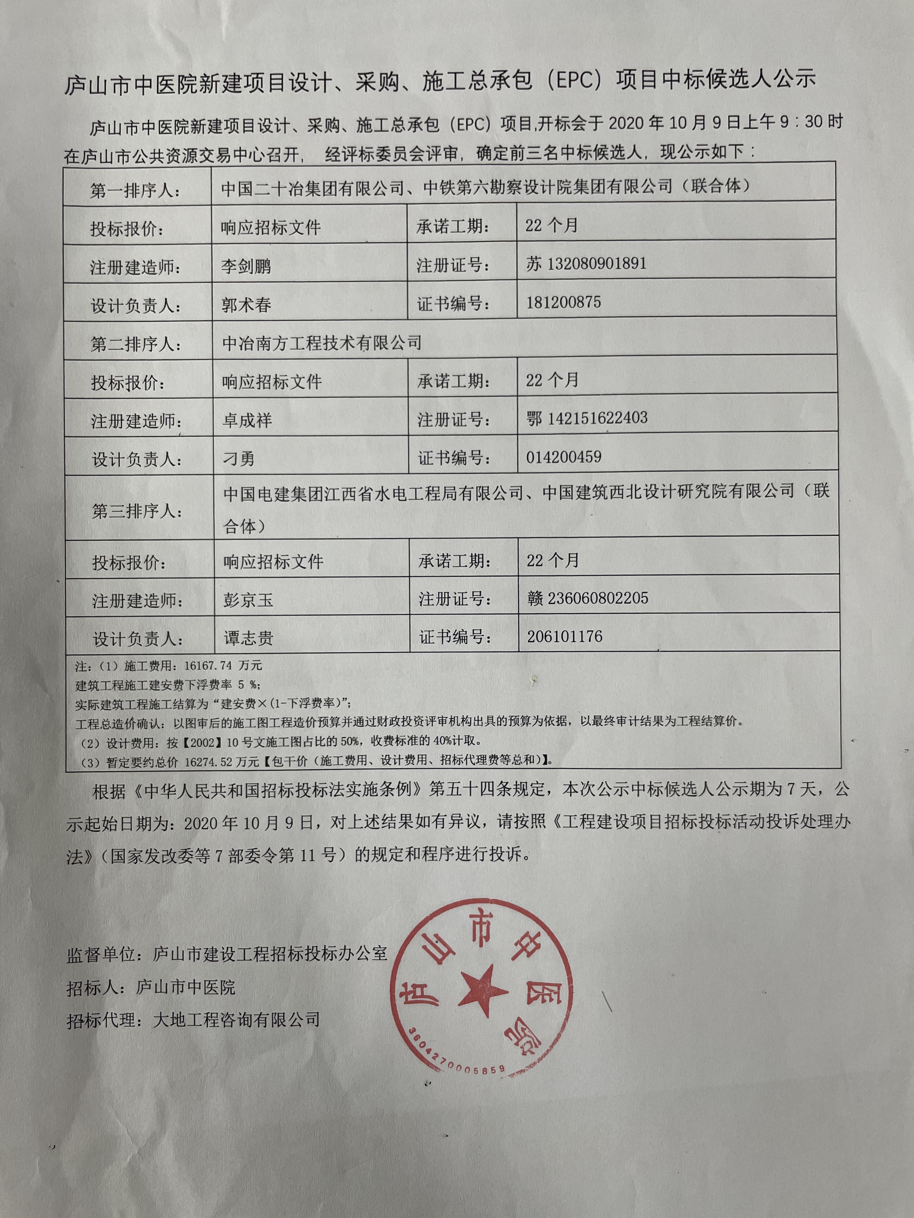 庐山市中医院新建项目设计、采购、施工总承包(EPC)项目中标候选人公示