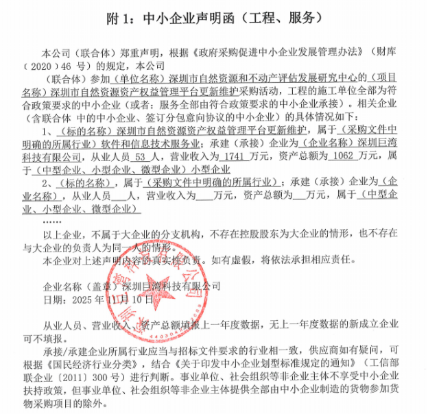 | * | 深圳巨湾科技有限公司 | *)营业执照(或事业单位法人证书)等证明资料复印件;*)法定代表人证明书;*)法定代表人授权书;*)政府采购投标及履约承诺函;*)投标与合规承诺函;*)招标代理服务费承诺书;*)投标报价;*)《供应商基本情况表》、社保缴纳证明材料、股权关系证明材料。 结论:资格核查通过。 | ¥***,***.** |