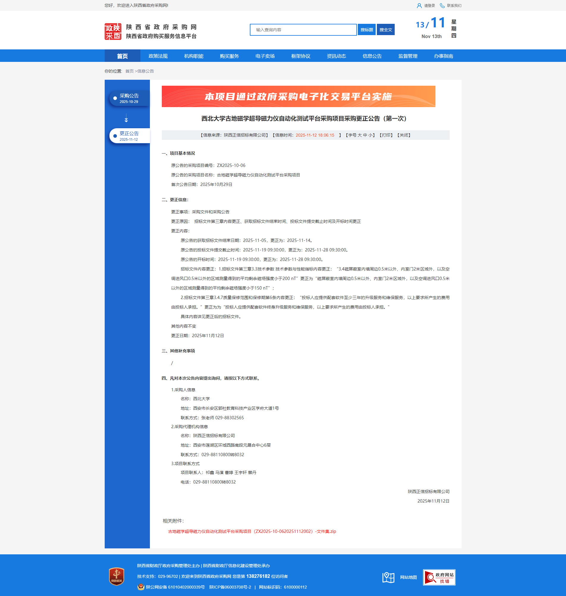西北大学古地磁学超导磁力仪自动化测试平台采购项目采购更正公告(第一次)