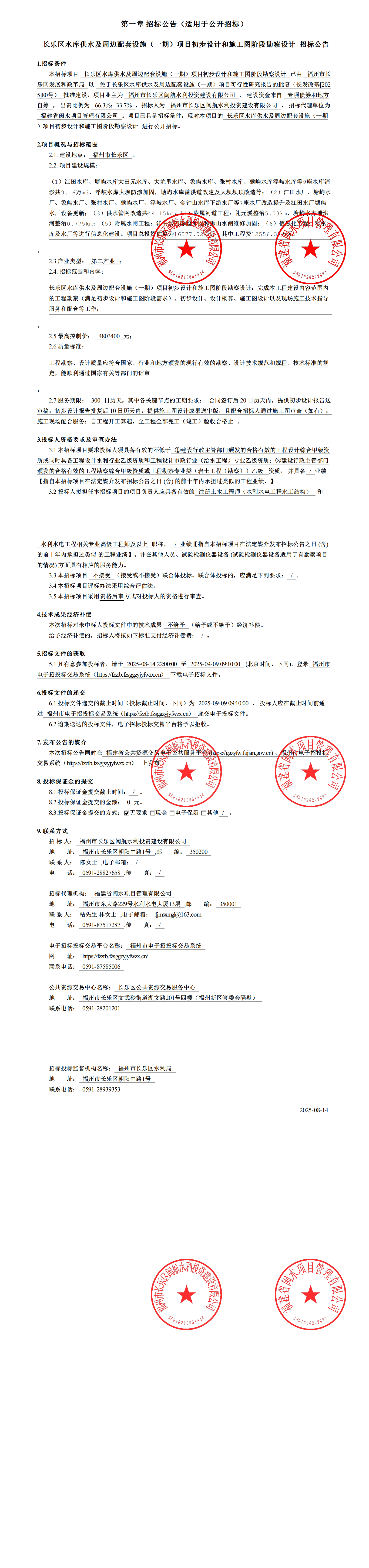 长乐区水库供水及周边配套设施(一期)项目初步设计和施工图阶段勘察设计