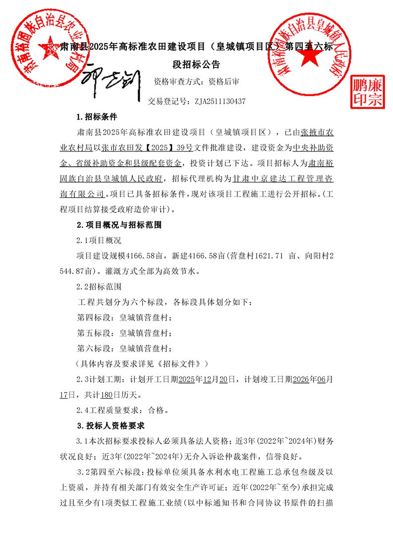 肃南县2025年高标准农田建设项目(皇城镇项目区)第四至六标段招标公告招标/资审公告