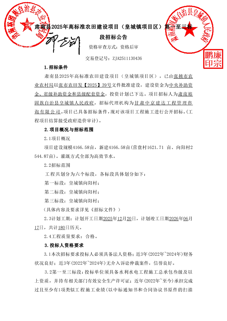 肃南县2025年高标准农田建设项目(皇城镇项目区)第一至三标段招标公告招标/资审公告
