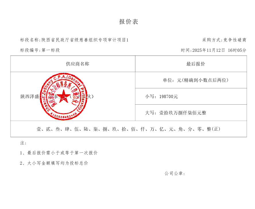 | * | 审计服务 | 陕西省慈善组织专项审计 | 详见磋商文件 | 详见磋商文件 | 详见磋商文件 | 详见磋商文件 | ***,***.** |