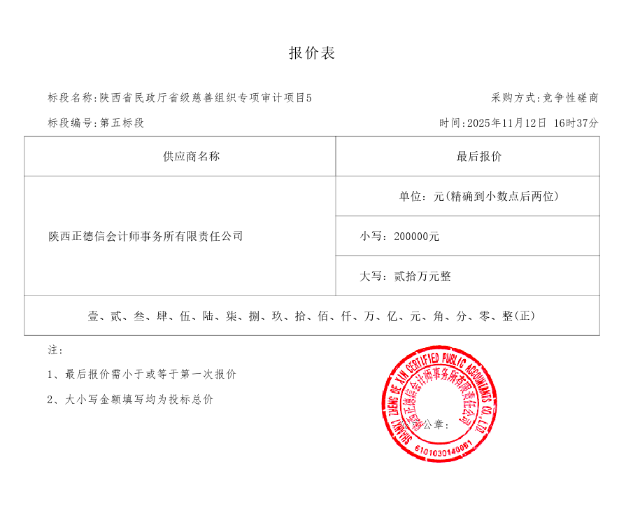 第五标段:陕西正德信会计师事务所有限责任公司评审总得分:***;评审平均分:**.**;最终得分:**.**