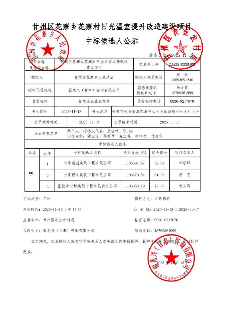 [市本级]甘州区花寨乡花寨村日光温室提升改造建设项目中标候选人公示交易结果公示