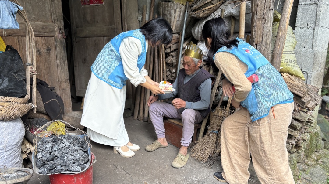 生日会结束后,工作人员带着剩余的生日蛋糕和提前准备的慰问品,上门看望未能出席的老人。在前洋市村独居的盛爷爷家,工作人员递上蛋糕,详细讲述生日会的热闹场景。盛爷爷接过蛋糕,眼眶微红:“虽然没去现场,但你们把心意送来,我心里一样暖和,谢谢你们记着我。”
