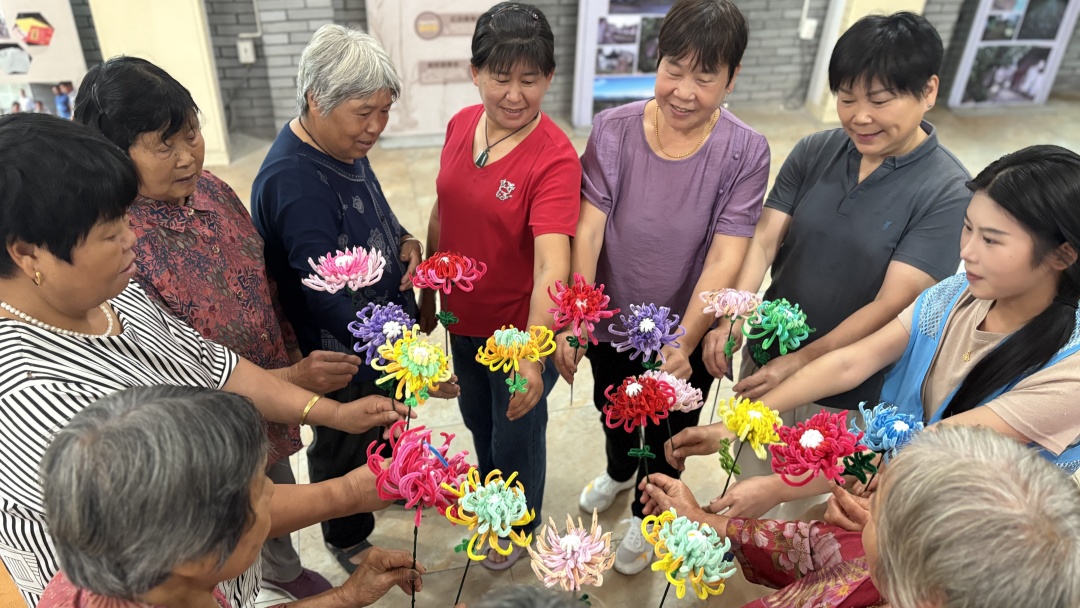 志愿者们搬着小凳子坐在老人们身边,手把手教大家做菊花。
