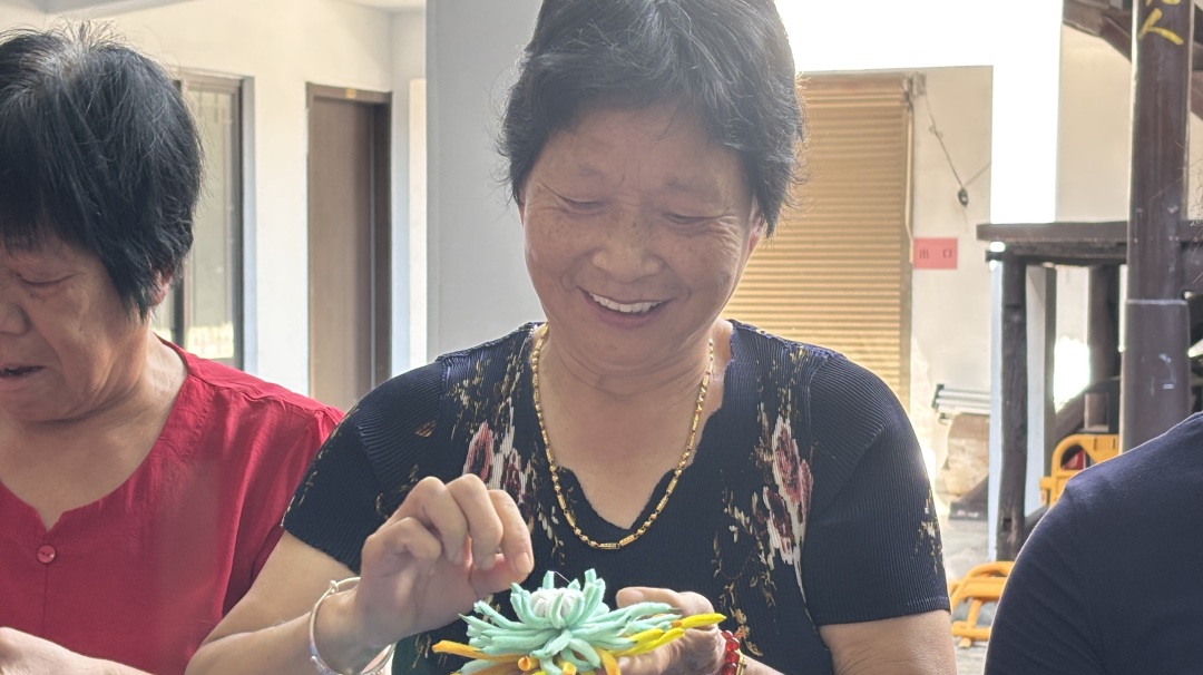 王渡村的潘奶奶举着亲手做的菊花,凑到身边的老人眼前,“你看我这个,花瓣是不是比你的更整齐?”