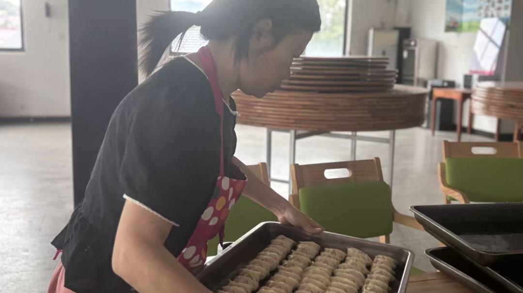 工作人员和提前采购新鲜食材,在老年食堂中心分工忙碌,说笑间,一排排形态各异的饺子摆满了托盘。