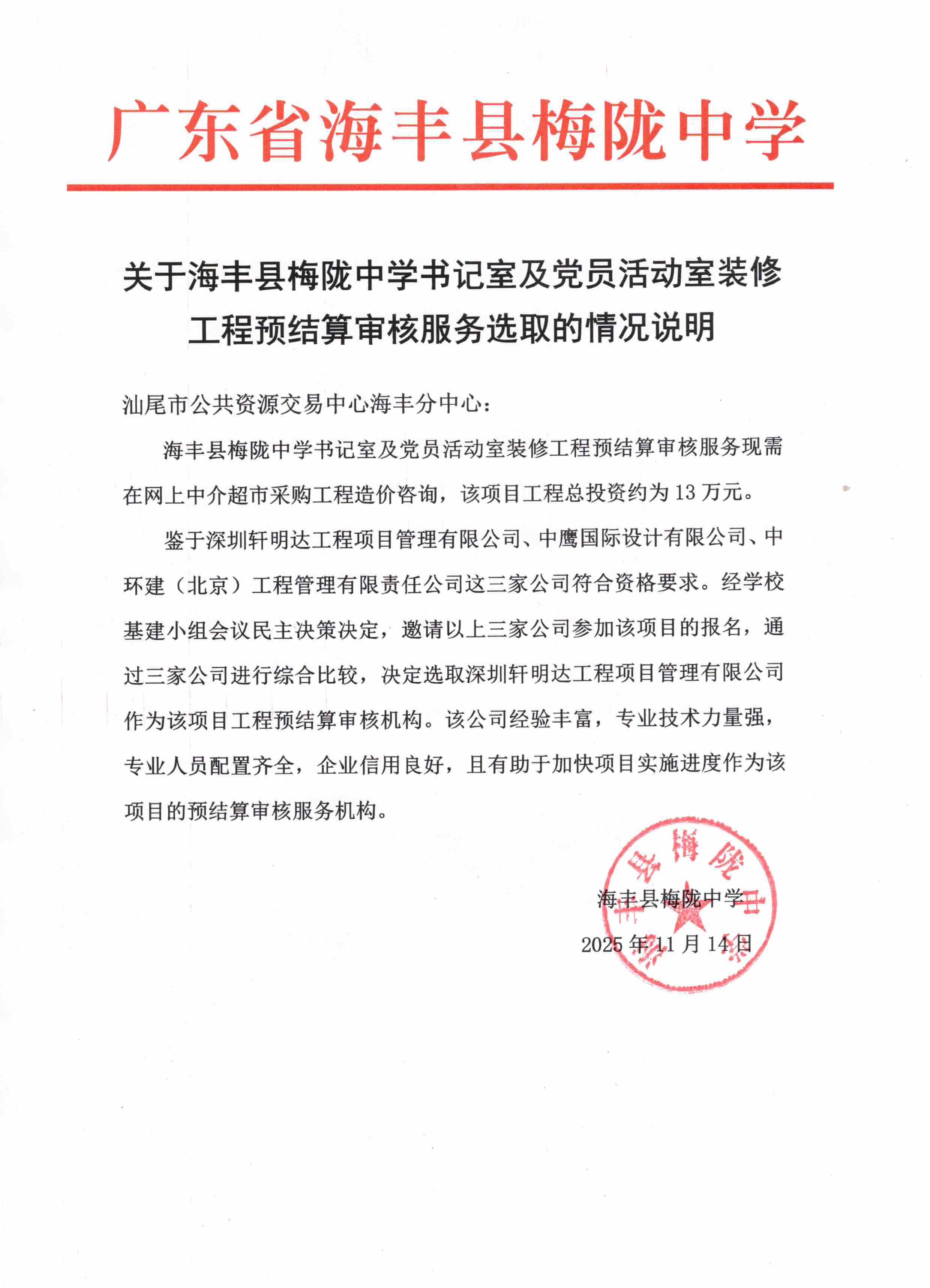 关于【海丰县梅陇中学书记室及党员活动室装修工程预结算审核服务】中选结果的公告