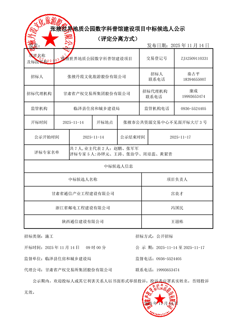 [市本级]张掖世界地质公园数字科普馆建设项目中标候选人公示