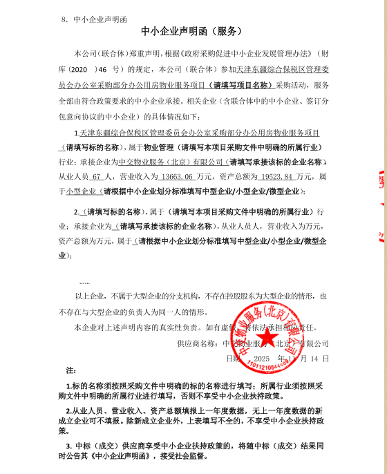 受中国共产党天津东疆综合保税区委员会办公室(天津东疆综合保税区管理委员会办公室)委托,天津市滨海新区政府采购中心以单一来源方式,对天津东疆综合保税区管理委员会办公室采购部分办公用房物业服务项目实施采购,现将成交结果公布如下: 一、项目名称和编号 *.项目名称:天津东疆综合保税区管理委员会办公室采购部分办公用房物业服务项目 *.项目编号:**************** 二、成交信息 *.成交供应商名称:中交物业服务(北京)有限公司 *.成交供应商地址:天津自贸试验区(东疆综合保税区)陕西道**号上东花苑自建配套*号楼负一层 *.成交金额:*******元 *.主要成交标标的名称、规格型号、数量、单价、服务要求或者标的基本概况:见附件 三、单一来源采购人员名单 周丽娅、王金安、于鹏(采购人代表) 四、项目联系人及联系方式 *.联系人:夏冰 *.联系电话:************ 五、采购人的名称、地址和联系方式 *.采购人名称:中国共产党天津东疆综合保税区委员会办公室(天津东疆综合保税区管理委员会办公室) *.采购人地址:天津东疆保税港区亚洲路****号 *.采购人联系电话:白鑫蕊 ************ 六、采购代理机构的名称、地址和联系方式 *.采购代理机构名称:天津市滨海新区政府采购中心 *.采购代理机构地址:天津市滨海新区营口道***号 *.采购代理机构联系方式:************ 七、质疑方式 参与本项目政府采购活动的供应商认为成交结果使自己的合法权益受到损害的,可以在成交结果公告期限届满之日起*个工作日内,以书面形式向采购人和天津市滨海新区政府采购中心提出质疑,逾期不予受理。 八、本项目不向成交供应商收取服务费。 九、成交结果公告期限 成交结果的公告期限为*个工作日。