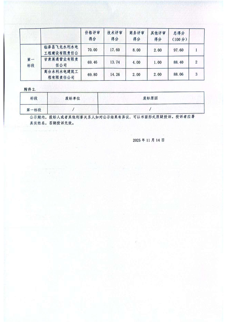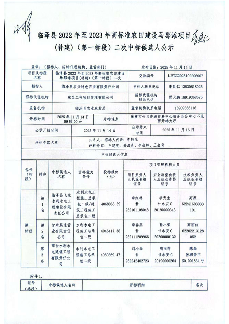[临泽县]临泽县2022年至2023年高标准农田建设马郡滩项目(补建)(第一标段)二次中标候选人公示