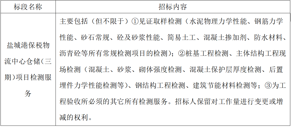 (*)项目标段划分:盐城港保税物流中心仓储(三期)项目检测服务共划分*个标段,标段信息如下: