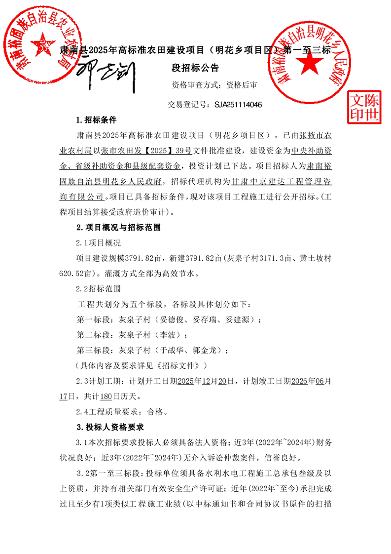 肃南县2025年高标准农田建设项目(明花乡项目区)第一至三标段招标公告