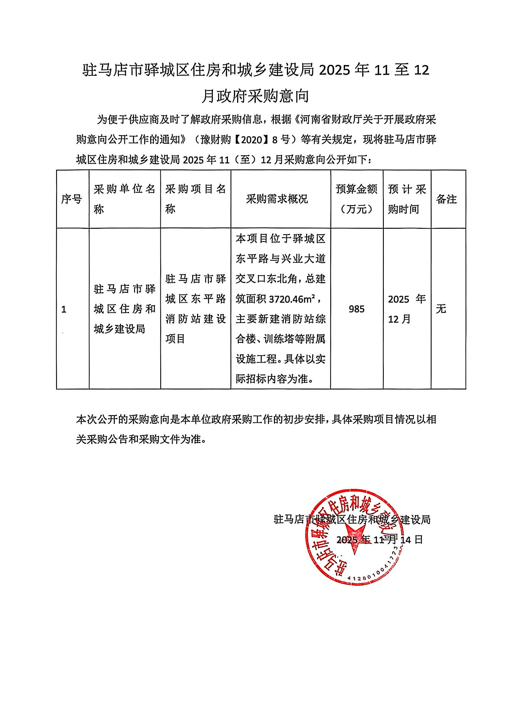 驻马店市驿城区住房和城乡建设局2025年11至12月政府采购意向