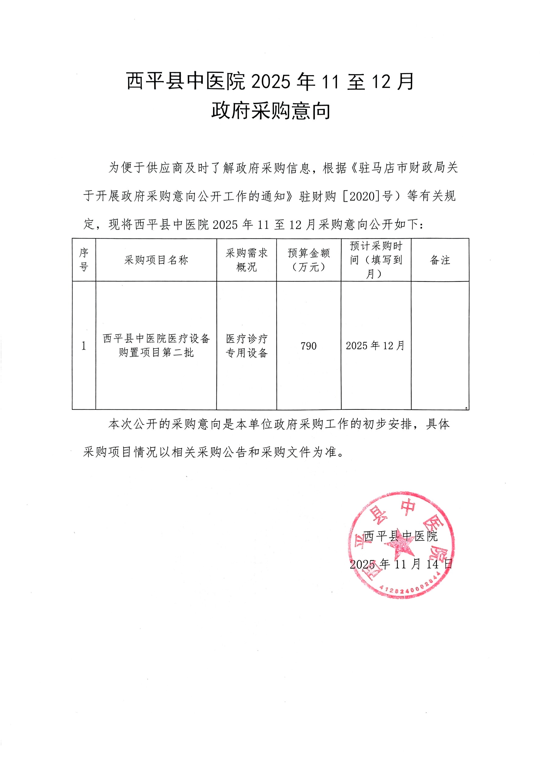 为便于供应商及时了解政府采购信息,根据《河南省财政厅关于开展政府采购意向公开工作的通知》(豫财购〔****〕*号)等有关规定,现将西平县中医院 ****年**(至)**月采购意向公开如下: |