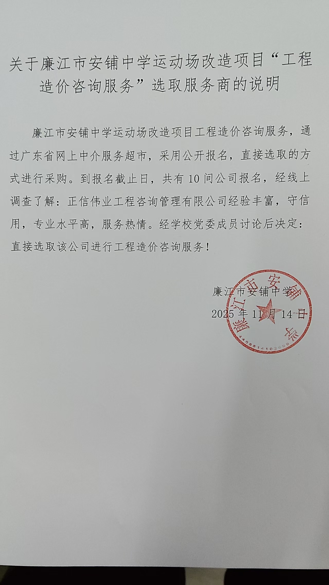 廉江市安铺中学运动场改造项目工程造价咨询服务,通过广东省网上中介服务超市,采用公开报名,直接选取的方式进行采购,到报名截止日,共有**间公司报名,经线上调查了解:正信伟业工程咨询管理有限公司资质高,守信用,没有不良记录,在全国各地设有分公司,实力宏厚,团队技术过硬。经学校党委讨论后决定:直接选取该公司进行工程设计!