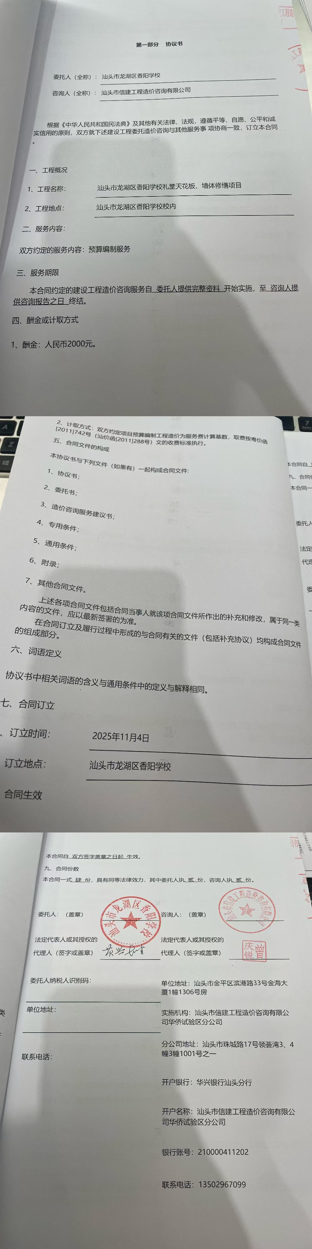 汕头市龙湖区香阳学校采购汕头市龙湖区香阳学校礼堂天花板、墙体修缮项目预算编制服务合同公开