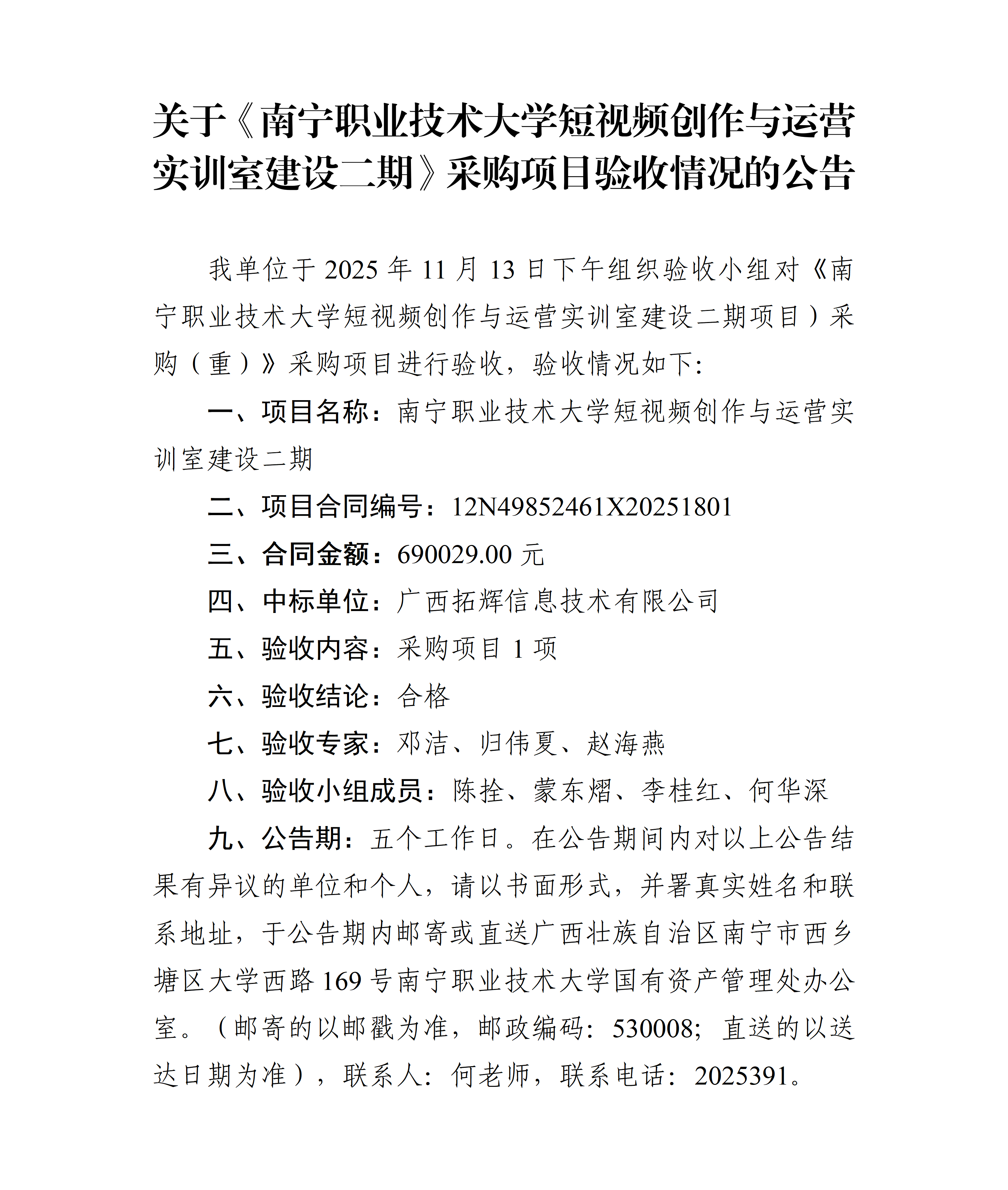 关于《南宁职业技术大学短视频创作与运营实训室建设二期》采购项目验收情况的公告