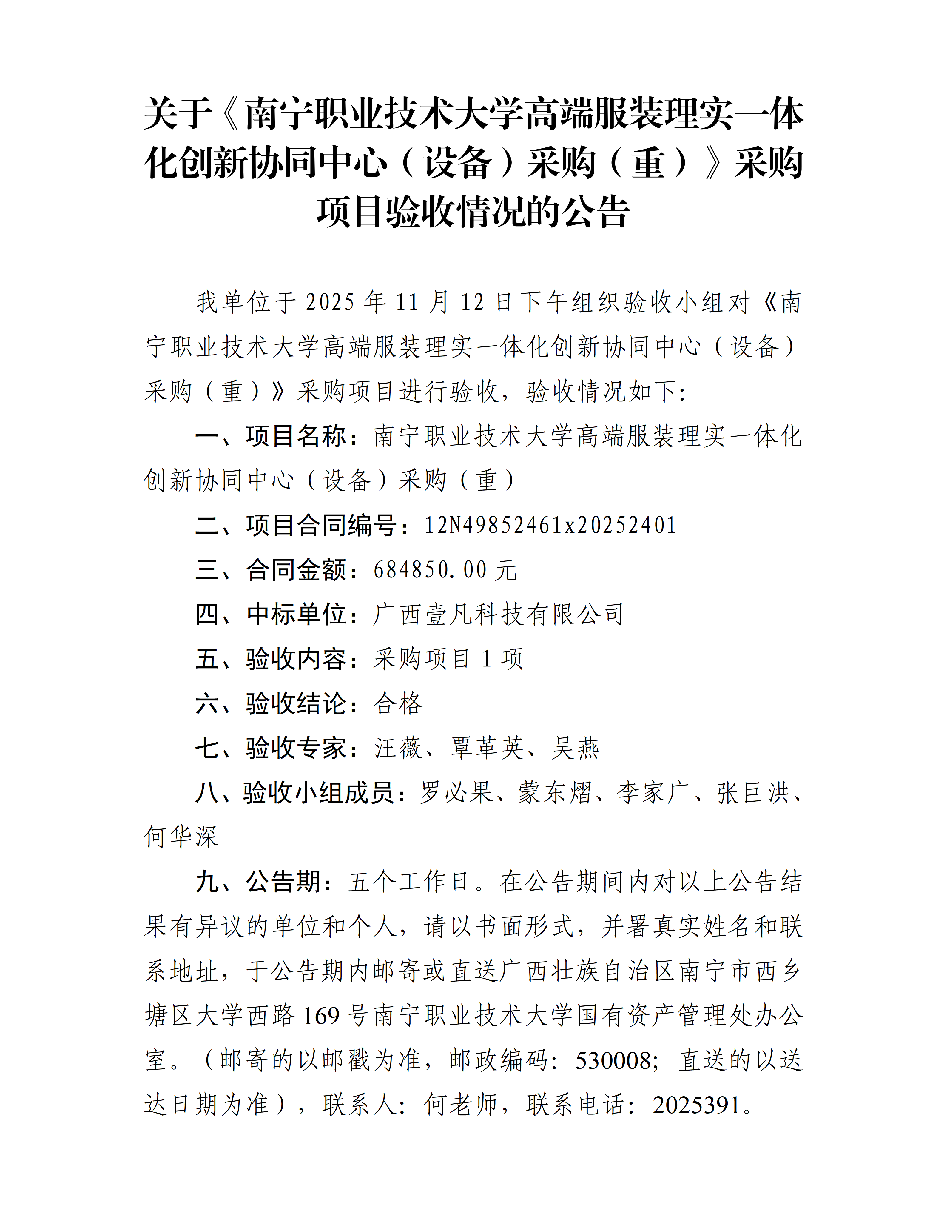 关于《南宁职业技术大学高端服装理实一体化创新协同中心(设备)采购(重)》采购项目验收情况的公告