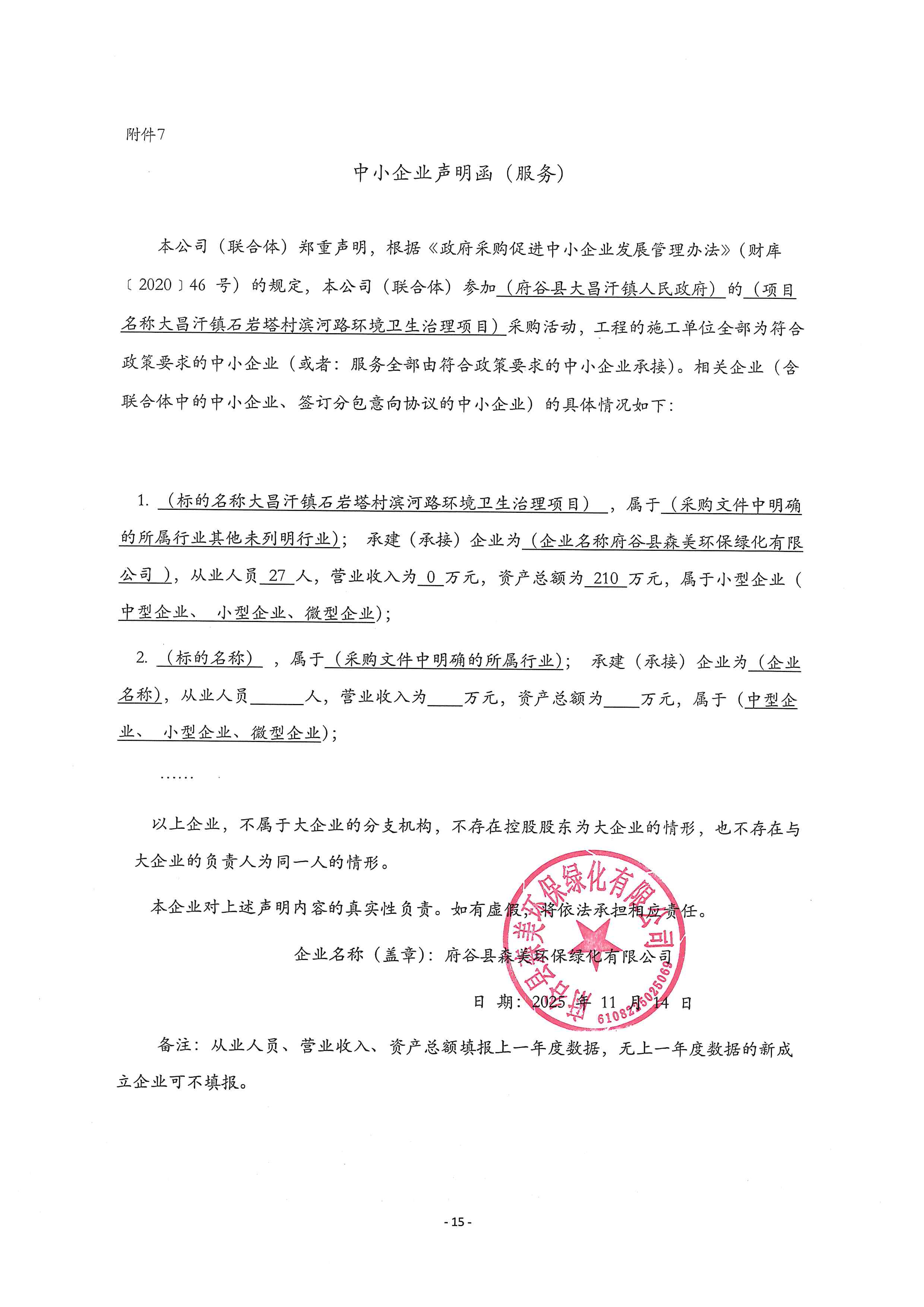 | * | 其他生态环境治理服务 | 大昌汗镇石岩塔村滨河路环境卫生治理项目 | 主要包括石岩塔村滨河路长**公里、宽**米的道路保洁及垃圾处理工作。 | 按有关规定采取严格的施工安全措施,并承担自身安全措施不力造成的事故责任和因此发生的费用及后果。环境卫生治理公司应为卫生清扫人员购买人身意外伤害保险及于工作有关的一切保险,凡在施工过程中发生的安全责任事故或其他责任,均由环境卫生治理公司承担责任,发包方概不负责。 | *年 | 达成国家现行质量验收规范合格标准,确保工程质量符合标准。(确保道路和人行道路面上无垃圾、乱堆乱放、积水等,路面牙石上无积土,绿化带内无垃圾、乱堆乱放、碎石等,垃圾及时清理完毕。) | ***,***.** |