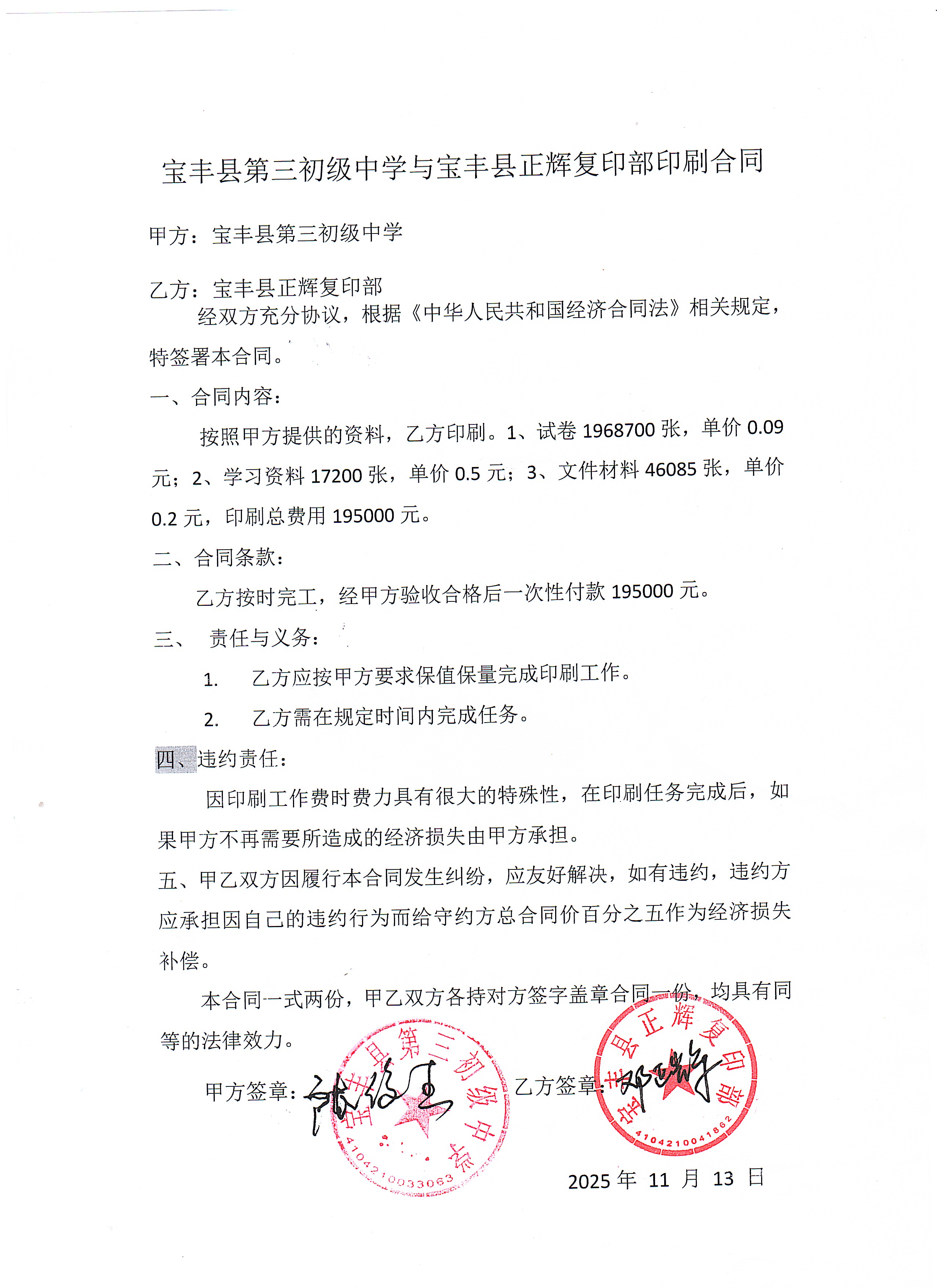| 二、合同名称:宝丰县第三初级中学采购文印服务* | ||||||||||||