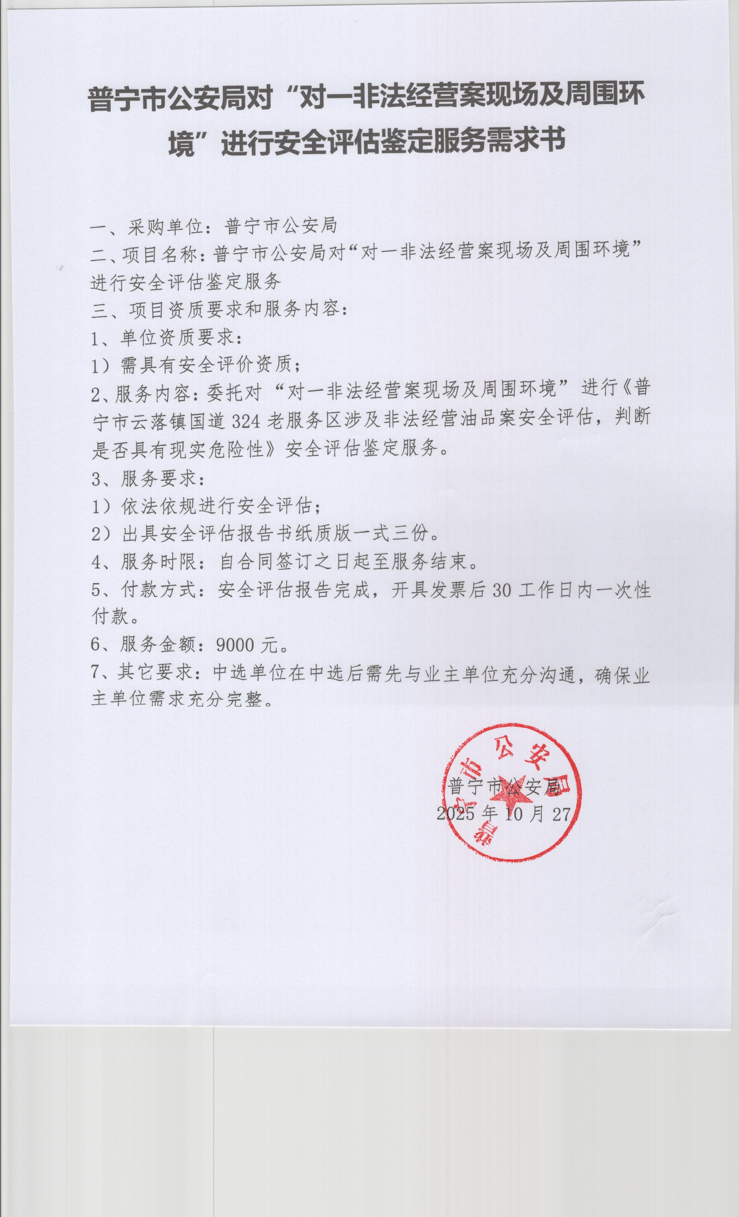 关于为【普宁市公安局对“对一非法经营案现场及周围环境” 进行安全评估鉴定服务】公开选取【安全评价】机构的公告