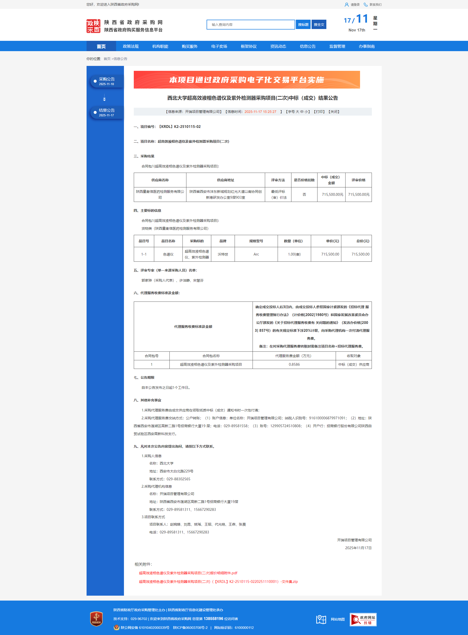 西北大学超高效液相色谱仪及紫外检测器采购项目(二次)中标(成交)结果公告