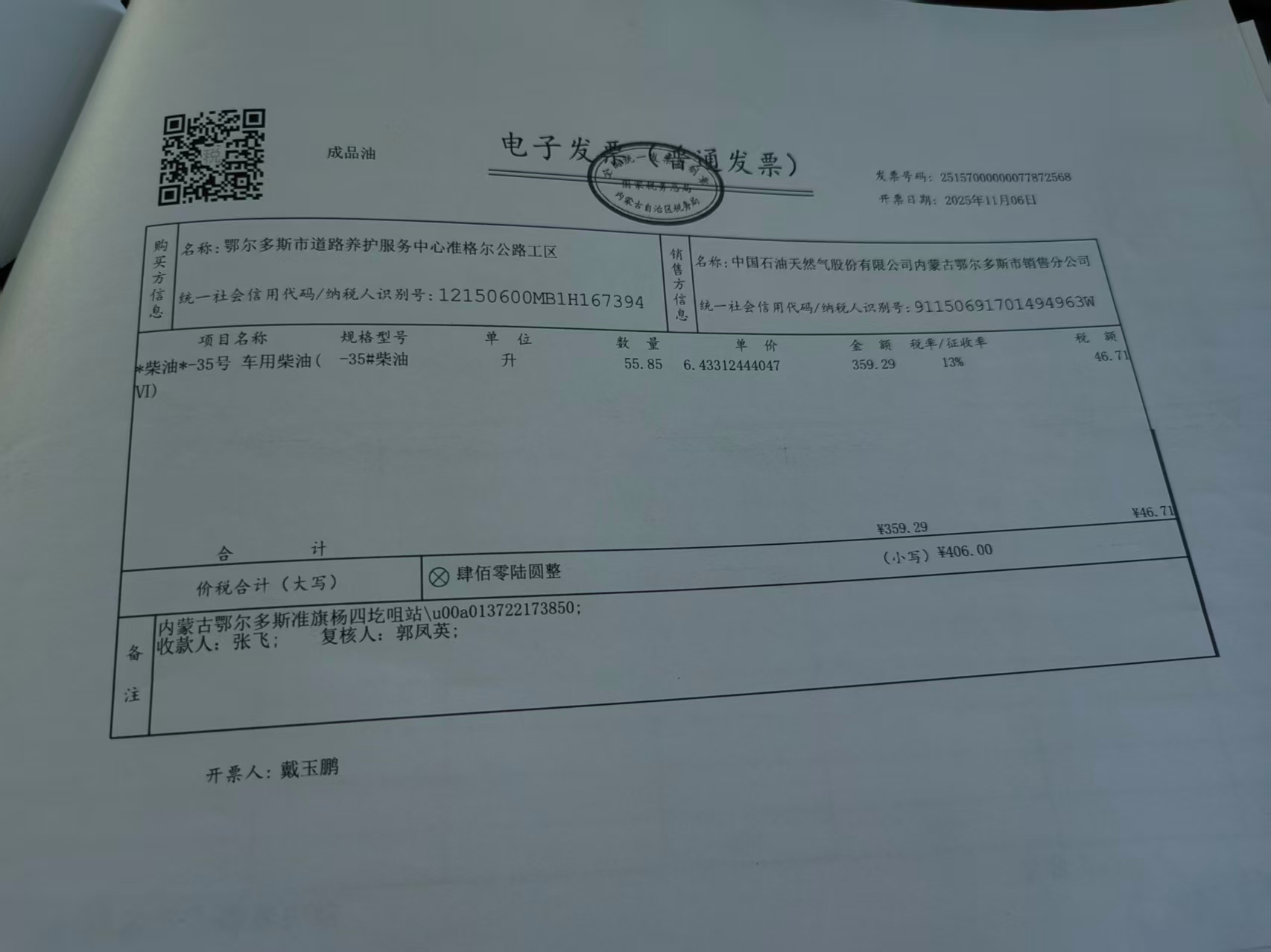 鄂尔多斯市道路养护服务中心准格尔公路工区前房子公路养护站车辆油料费(麻...