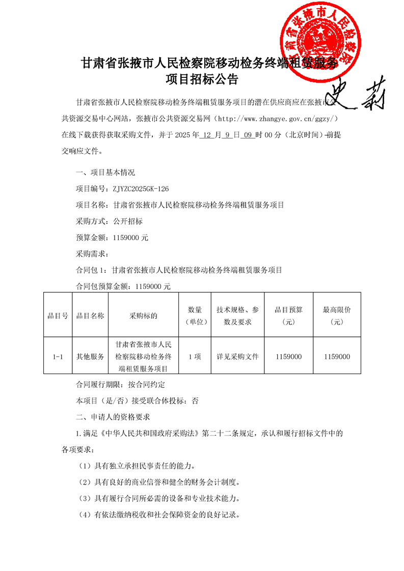 甘肃省张掖市人民检察院移动检务终端租赁服务项目招标公告