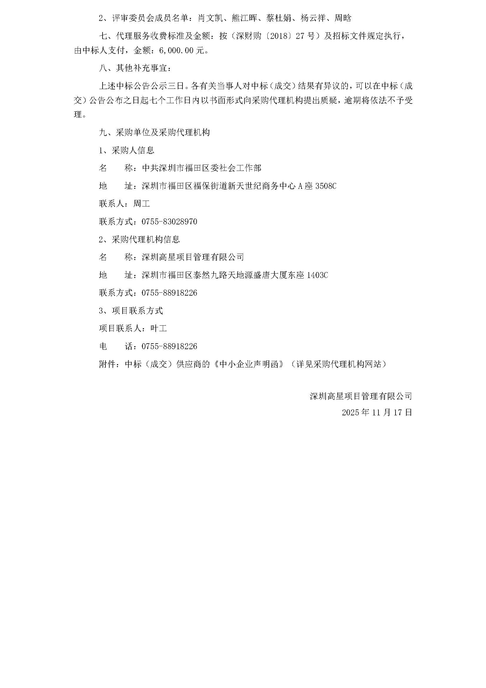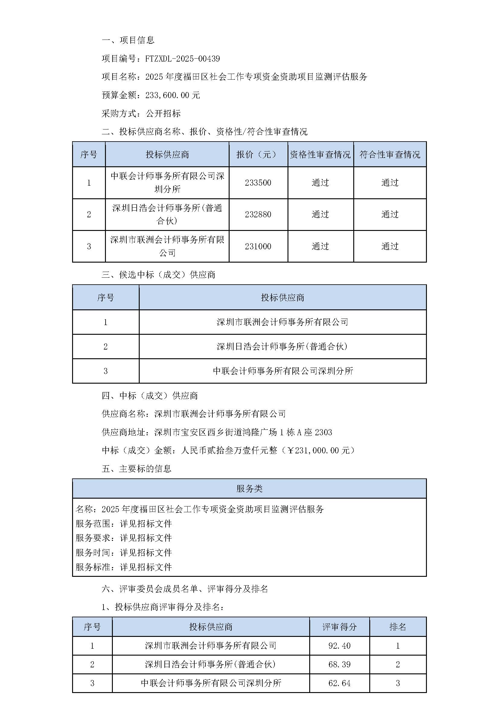 52025年度福田区社会工作专项资金资助项目监测评估服务的采购结果公告