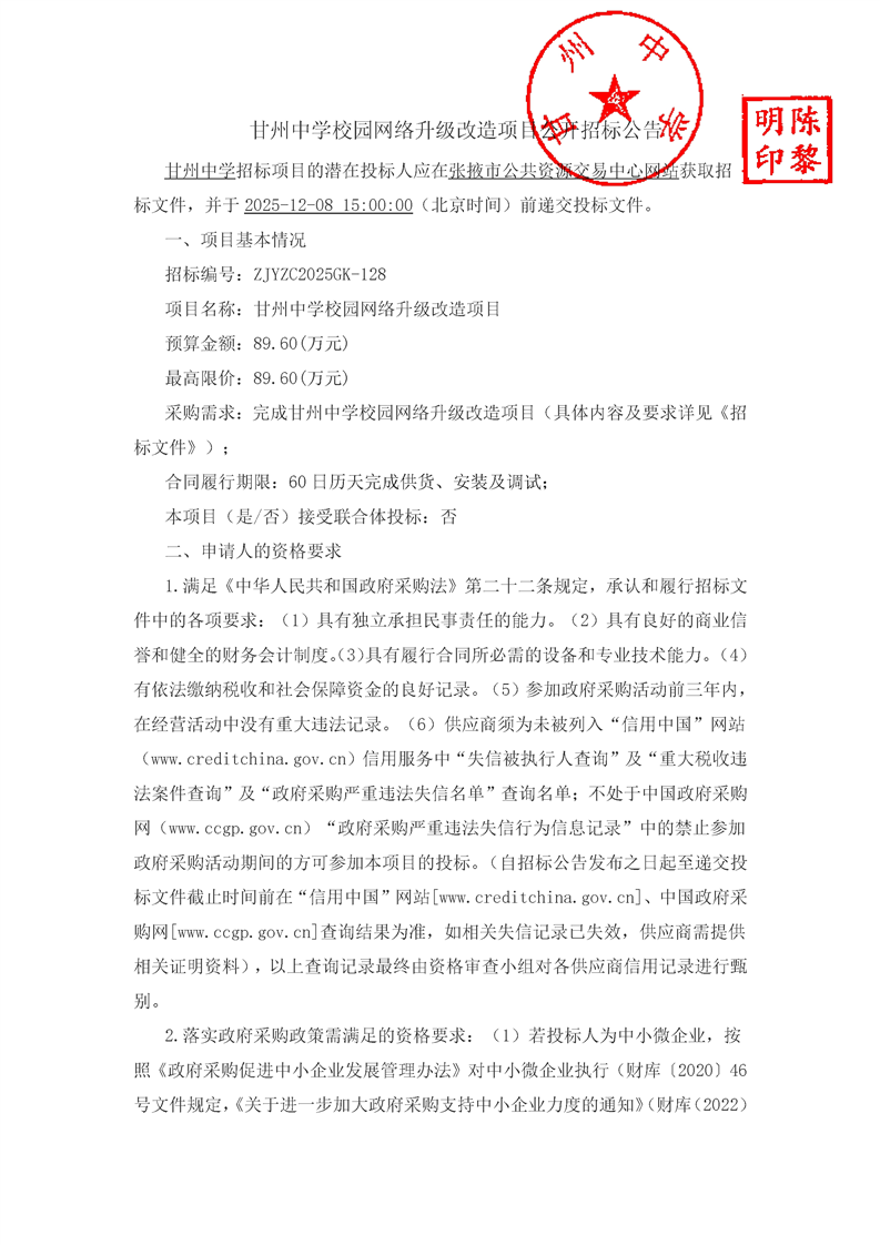 甘州中学校园网络升级改造项目公开招标公告