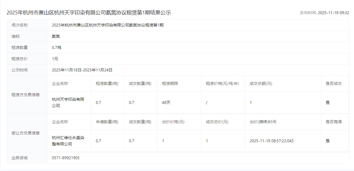 2025年杭州市萧山区杭州天宇印染有限公司氨氮协议租赁第1期结果公示
