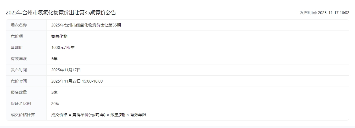 2025年台州市氮氧化物竞价出让第35期竞价公告