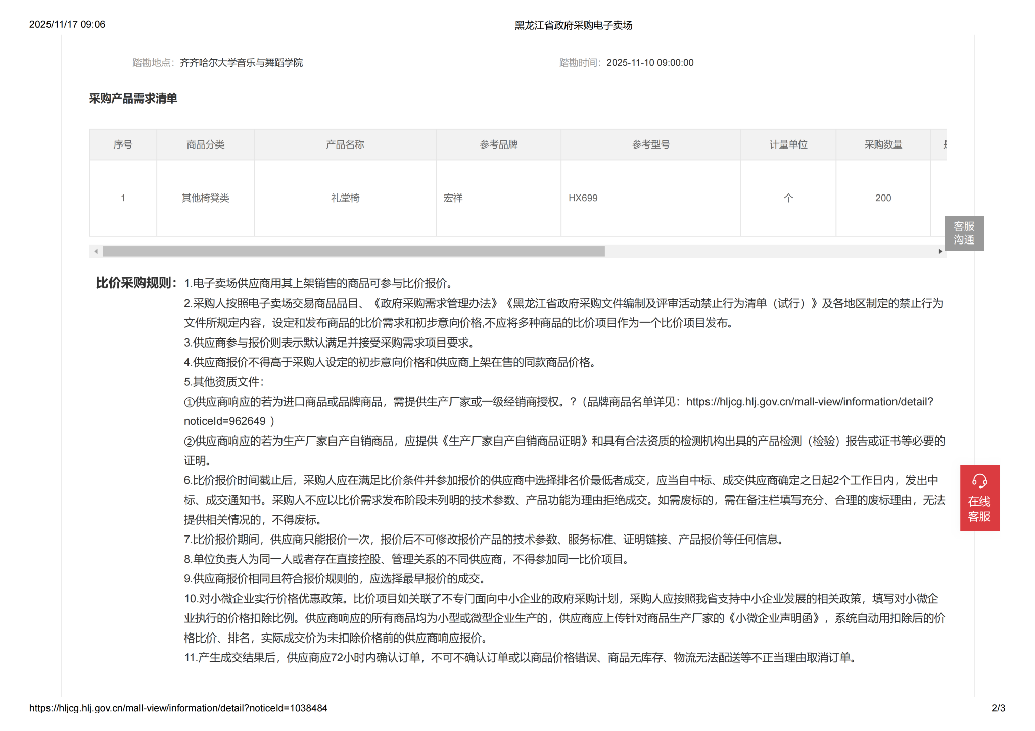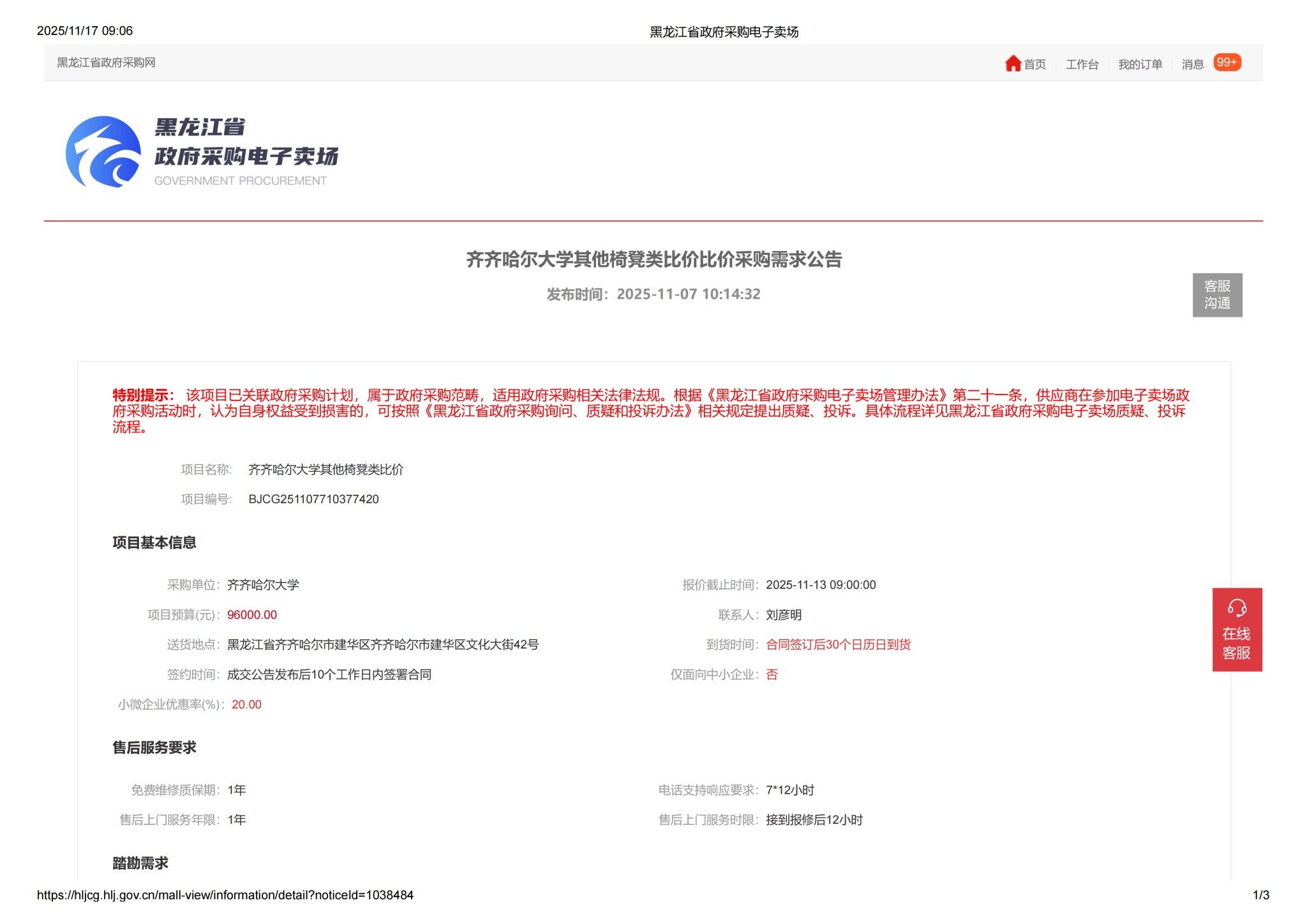 齐齐哈尔大学其他椅凳类比价采购需求公告(转自黑龙江省政府采购网)