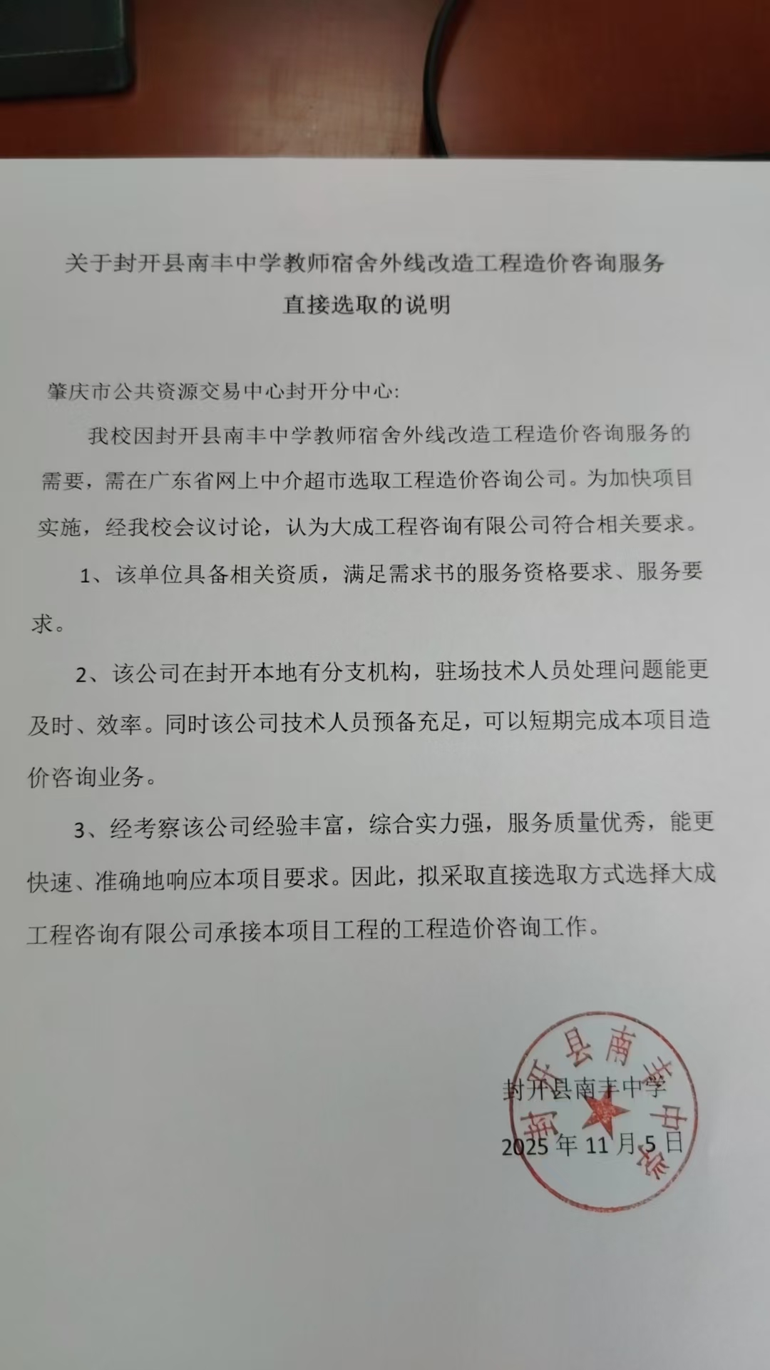 关于【封开县南丰中学教师宿舍外线改造工程】中选结果的公告