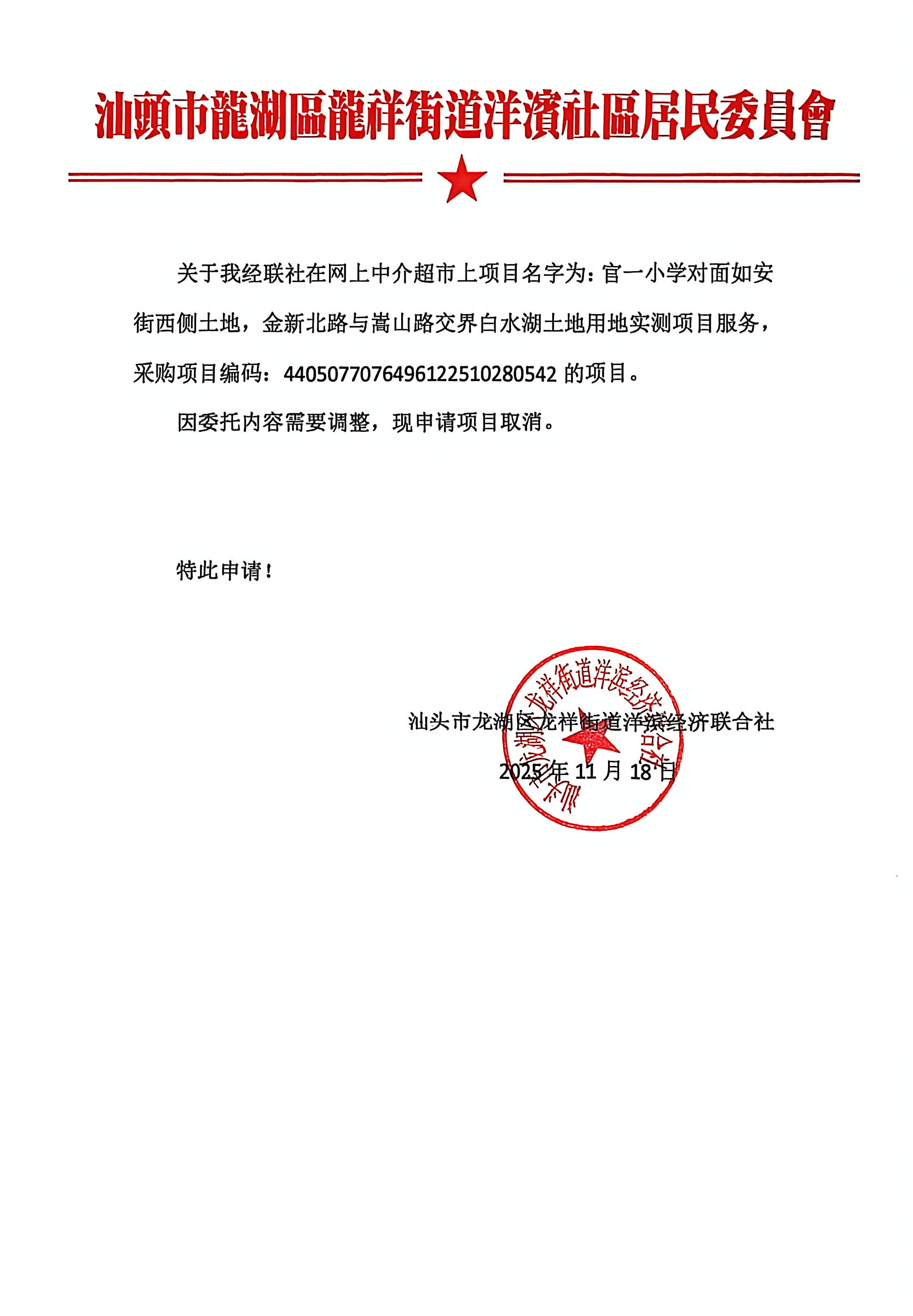 关于【汕头市龙湖区龙祥街道洋滨经济联合社 采购 官一小学对面如安街西侧土地,金新北路与嵩山路交界白水湖土地用地实测项目服务】采购失败项目的公示