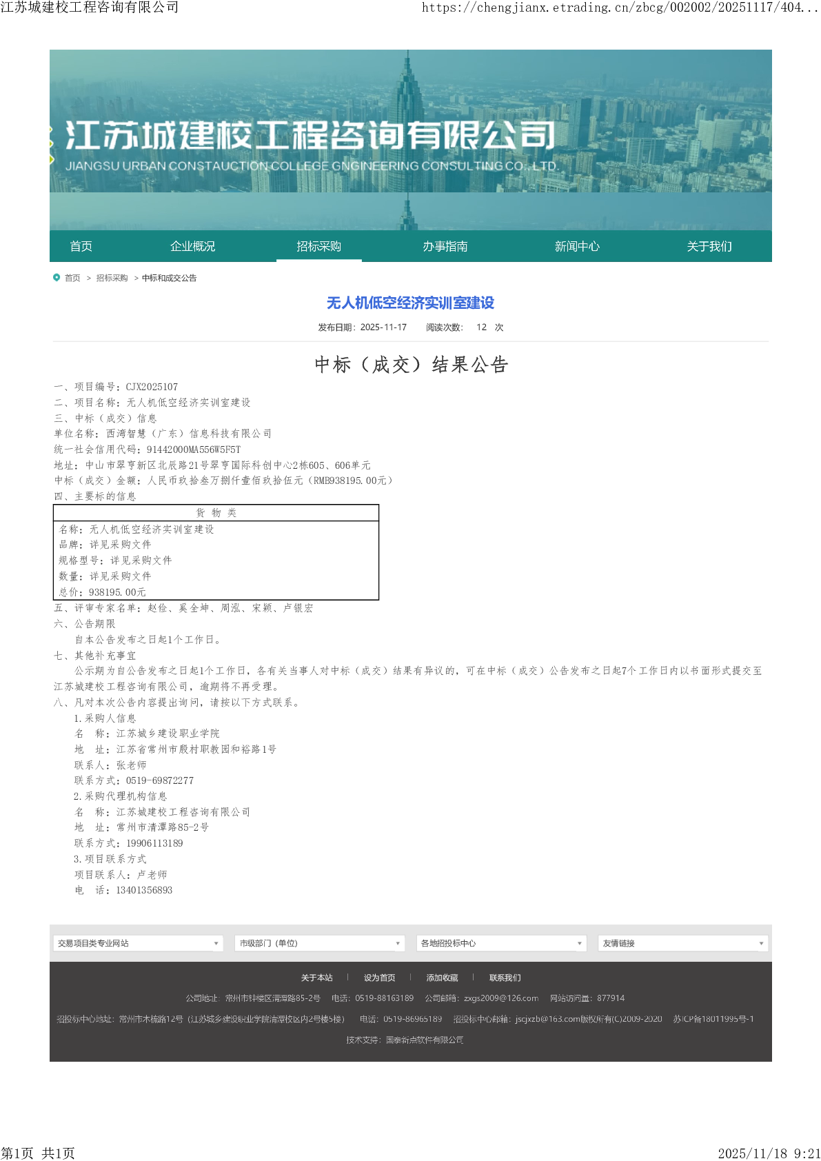 江苏城乡建设职业学院无人机低空经济实训室建设中标公告