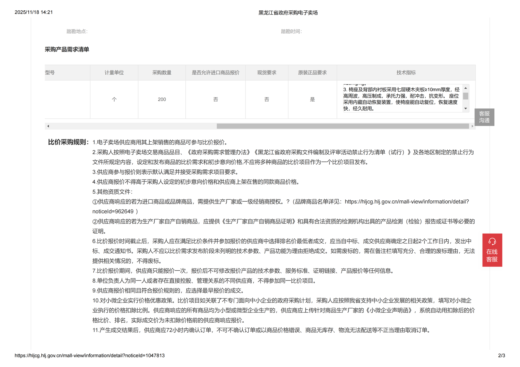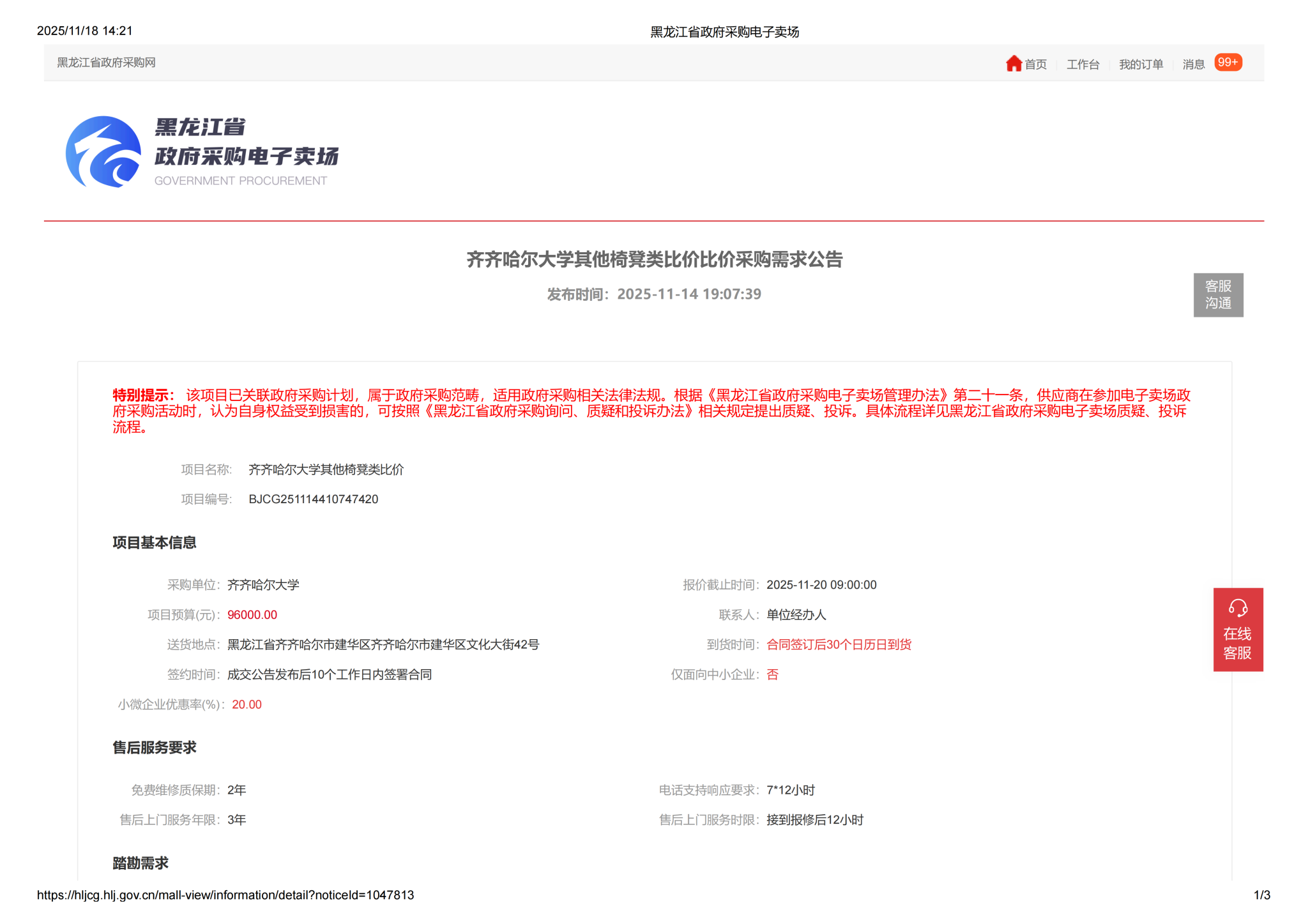齐齐哈尔大学其他椅凳类比价采购需求公告(二次)(转自黑龙江省政府采购网)