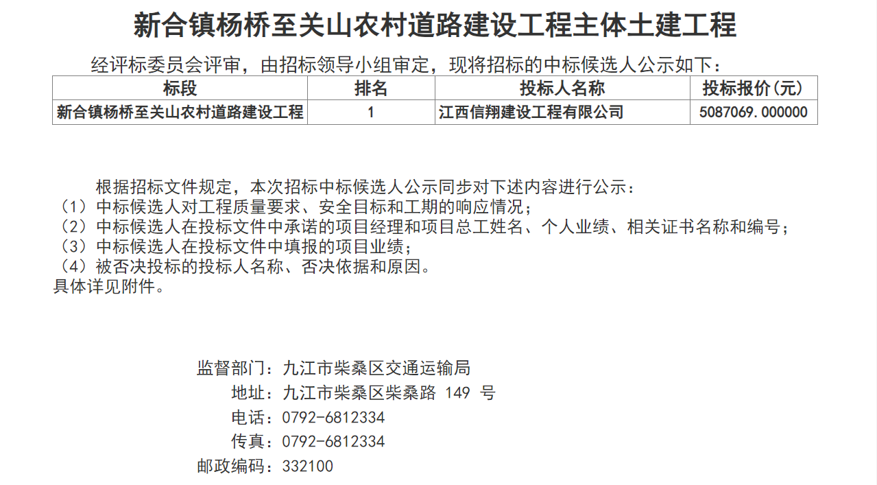 新合镇杨桥至关山农村道路建设工程主体土建工程中标公示