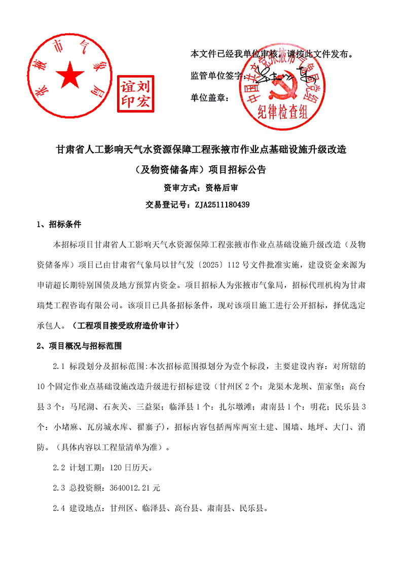 甘肃省人工影响天气水资源保障工程张掖市作业点基础设施升级改造(及物资储备库)项目招标/资审公告