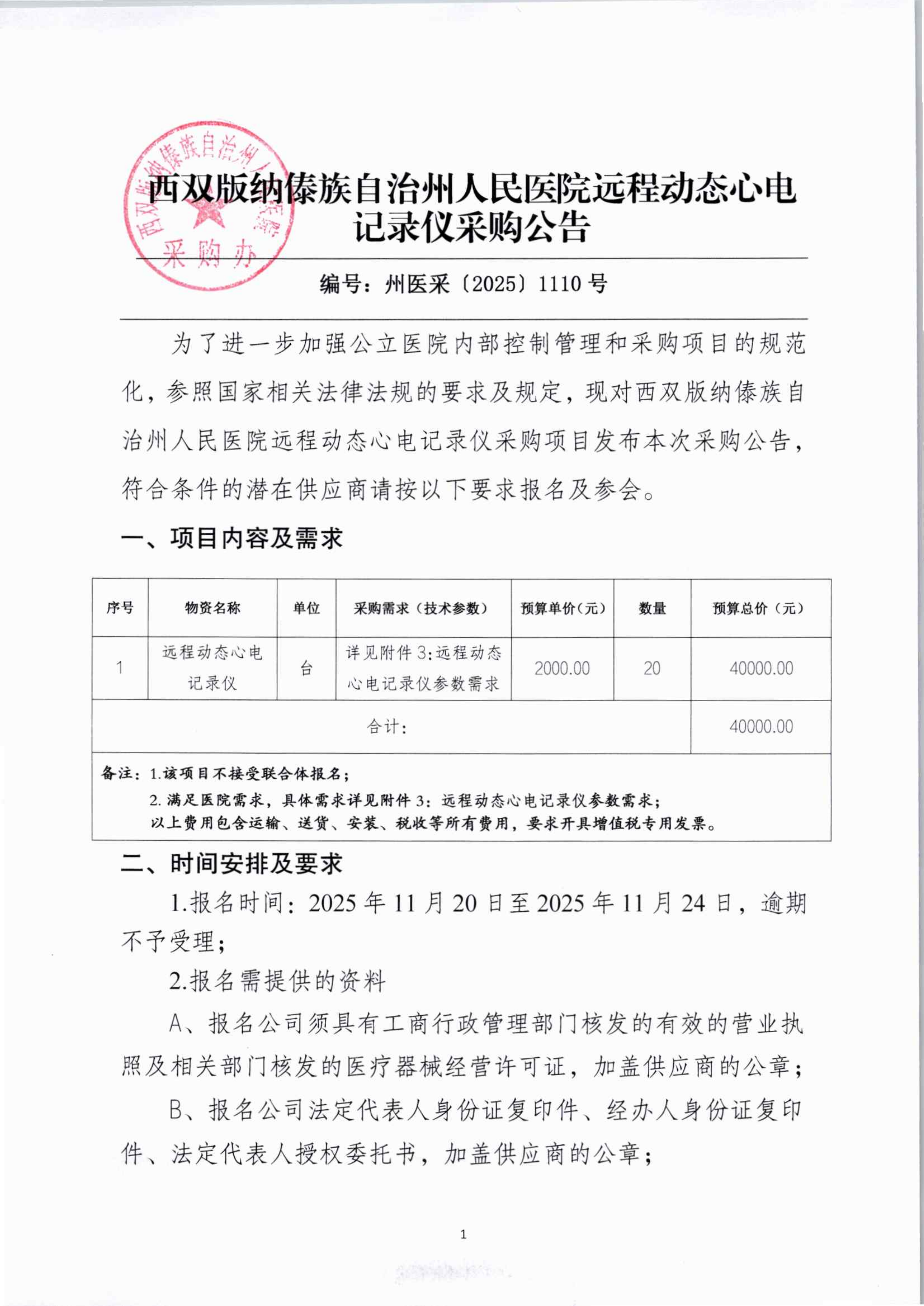 西双版纳傣族自治州人民医院远程动态心电记录仪采购公告