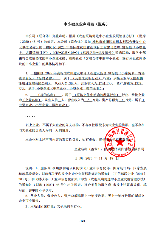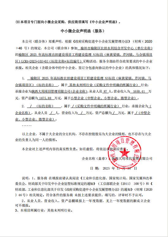 | * | 工程监理服务 | 榆阳区****年高标准农田建设项目工程建设监理**标段(小纪汗镇、红石桥乡项目区) | 符合招标文件要求 | 符合招标文件要求 | 详见招标文件 | 符合招标文件要求 | ***,***.** |