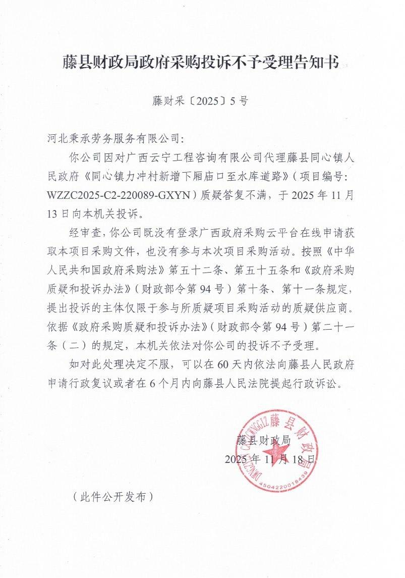 藤县财政局政府采购投诉不予受理告知书 藤财采〔2025〕5号
