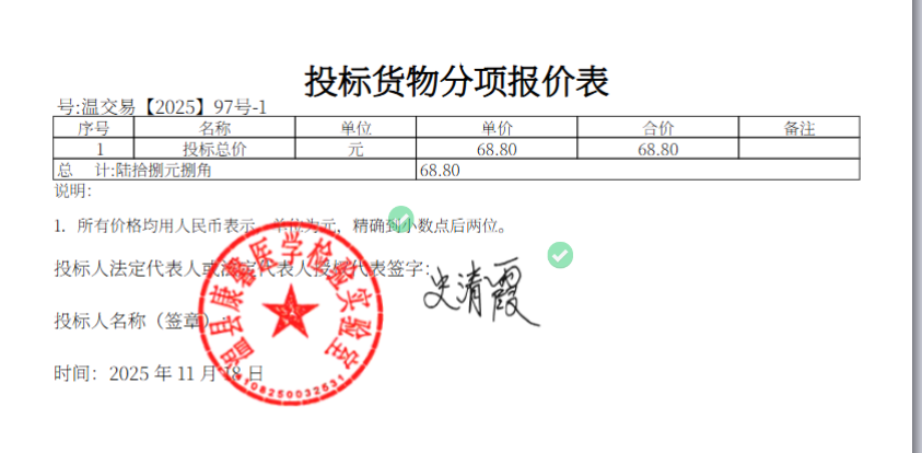 | *、各供应商排名及得分情况: 排序*:温县康馨医学检验实验室 (最终报价:**.**%;得分:**.**) 排序*:郑州久和医学检验实验室有限公司 (最终报价:**.**%;得分:**.**) 排序*:河南贝思科成长医学检验有限公司 (最终报价:**.**%;得分:**.**) 排序*:郑州诺森医学检验有限公司 (最终报价:**.**%;得分:**.**) *、废标情况:无。 *、各有关当事人对中标结果公告有异议的,可以在中标结果公告期限届满之日起七个工作日内,以书面形式向采购人提出质疑,并以供应商提交的质疑函接受确认日期作为受理时间,逾期未提交的不再受理。 | |||||||||||||||||||||||||||||||