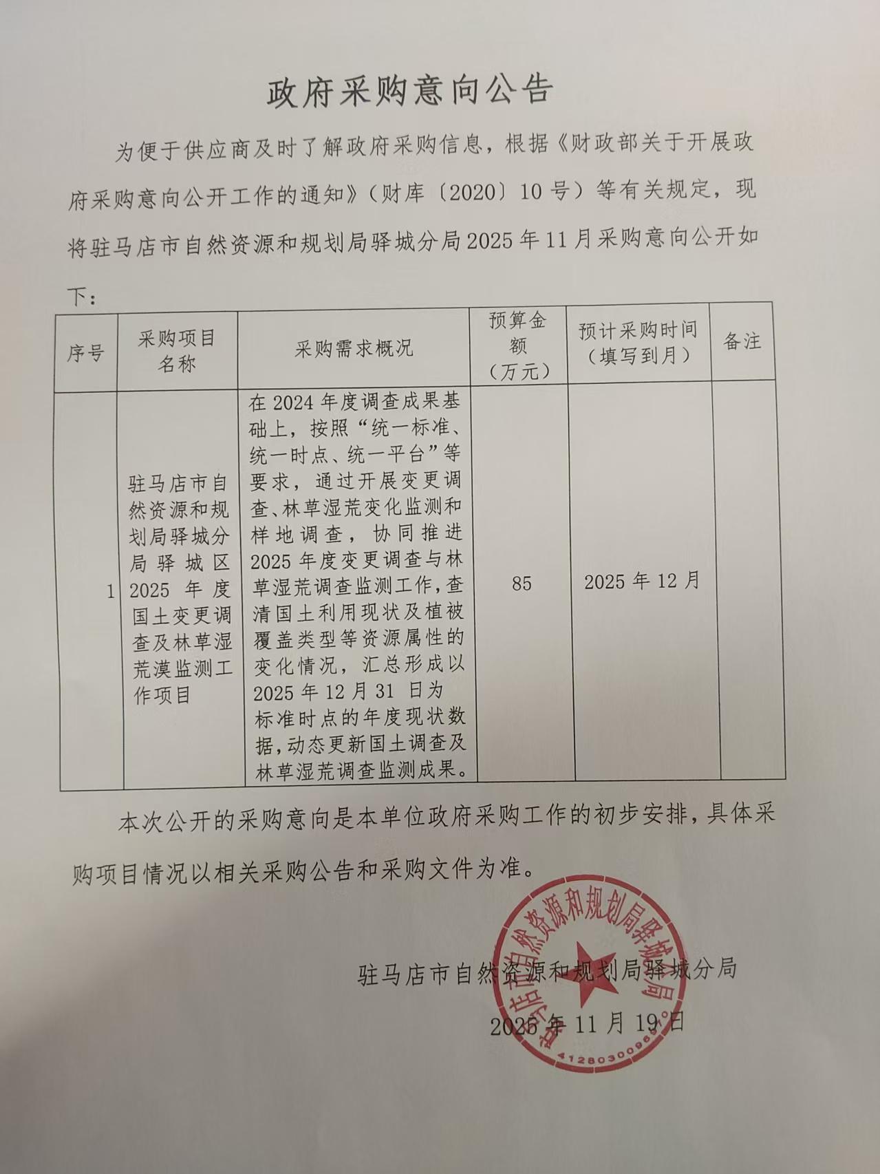驻马店市自然资源和规划局驿城分局2025年11至12月政府采购意向
