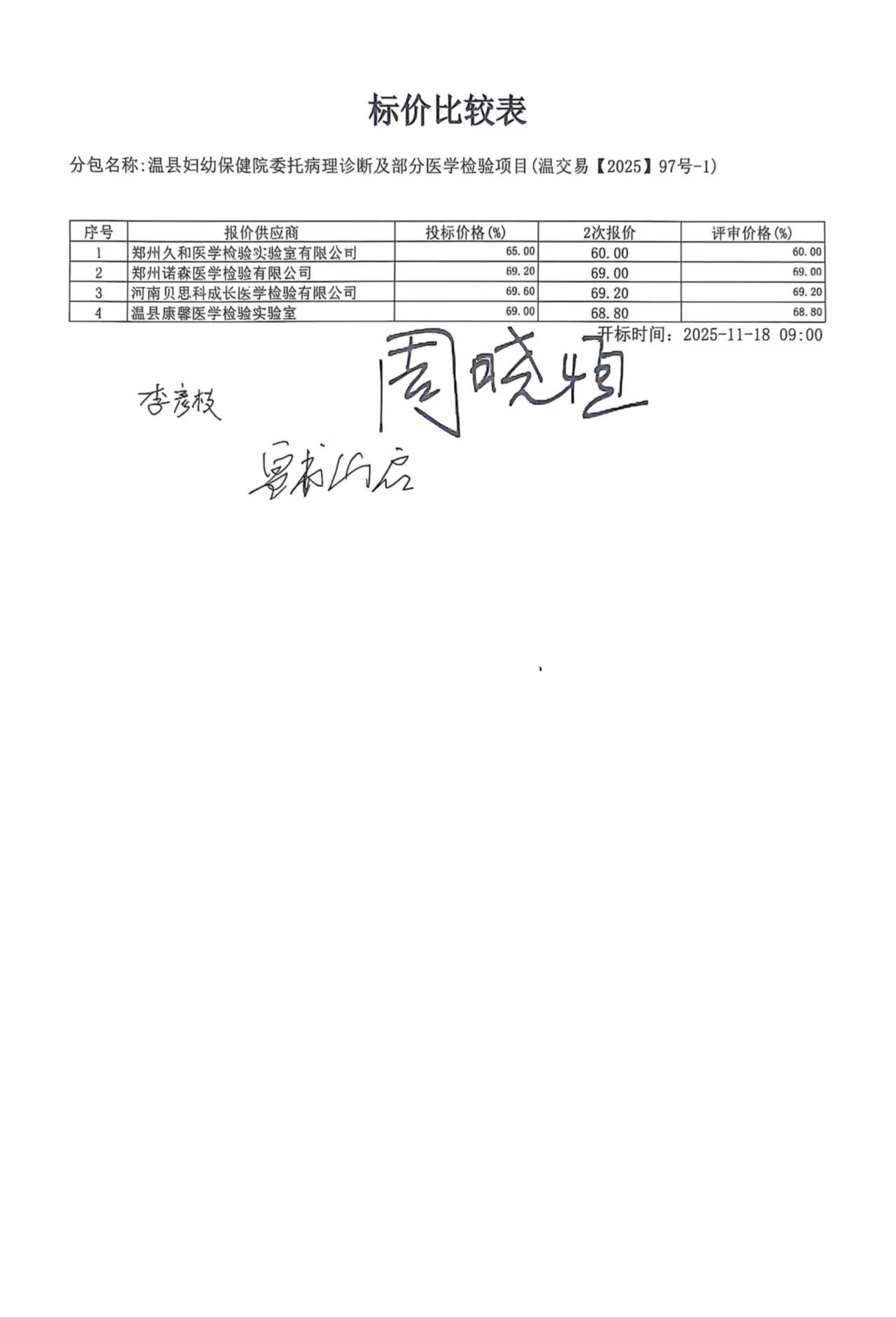| *、各供应商排名及得分情况: 排序*:温县康馨医学检验实验室 (最终报价:**.**%;得分:**.**) 排序*:郑州久和医学检验实验室有限公司 (最终报价:**.**%;得分:**.**) 排序*:河南贝思科成长医学检验有限公司 (最终报价:**.**%;得分:**.**) 排序*:郑州诺森医学检验有限公司 (最终报价:**.**%;得分:**.**) *、废标情况:无。 *、各有关当事人对中标结果公告有异议的,可以在中标结果公告期限届满之日起七个工作日内,以书面形式向采购人提出质疑,并以供应商提交的质疑函接受确认日期作为受理时间,逾期未提交的不再受理。 | |||||||||||||||||||||||||||||||