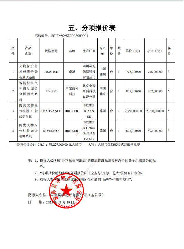 | *** | 其他仪器仪表 | 文物材料物相、宏观微观结构平台等设备 | 详见分项报价表 | 详见分项报价表 | *.**(批) | *,***,***.** | *,***,***.** |